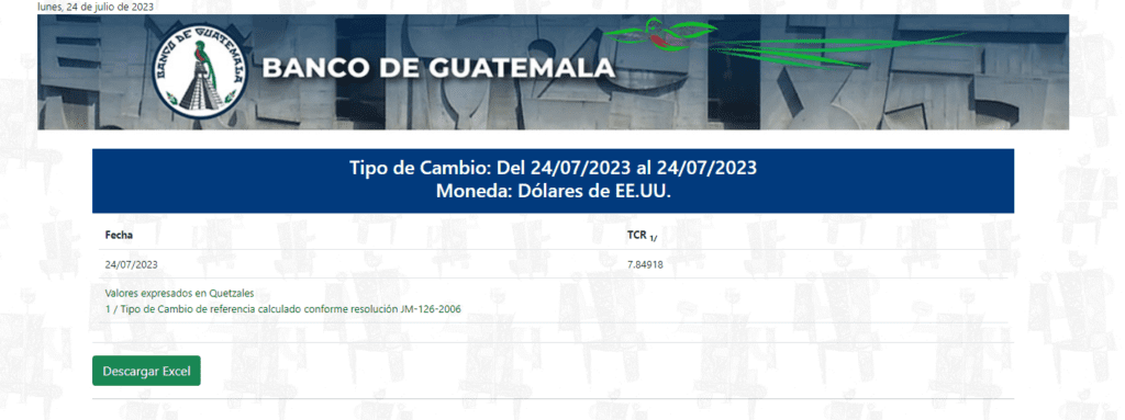 El Banco de Guatemala ha comunicado la actualización del tipo de cambio del quetzal frente al dólar para el lunes 24 de julio de 2023. Según los últimos datos, el tipo de cambio quedó establecido en Q7.84918 por dólar, registrando una variación de 0.00005 en comparación con el día anterior.