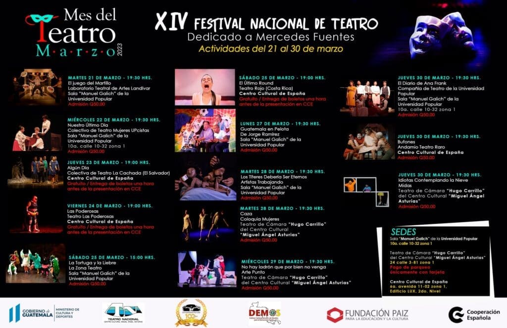La décimo cuarta edición del Festival Nacional de Teatro se llevará a cabo del 21 al 30 de marzo con la participación de compañías guatemaltecas e internacionales que se presentarán en funciones especiales en tres escenarios distintos en la ciudad de Guatemala.