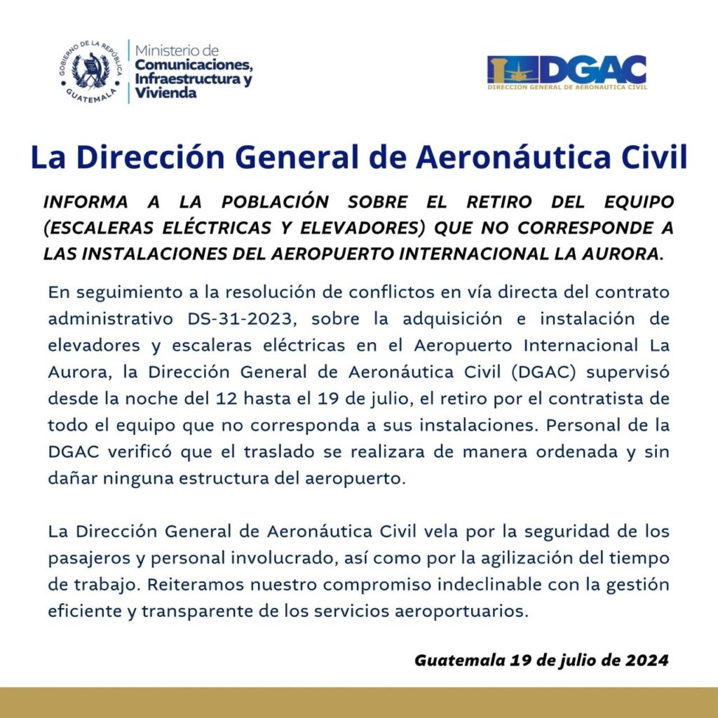 La Dirección General de Aeronáutica Civil (DGAC) anunció el viernes 19 de julio la finalización del retiro de escaleras eléctricas y ascensores que no correspondían a las especificaciones del Aeropuerto Internacional La Aurora en la zona 13 de la capital.