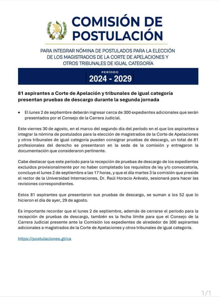 Por el momento, 133 profesionales del derecho han presentado sus pruebas de descargo, de los cuales 52 lo hicieron el 29 de agosto. Además, se espera que el Consejo de la Carrera Judicial entregue cerca de 300 expedientes adicionales, completando así la revisión para la elección de magistrados.