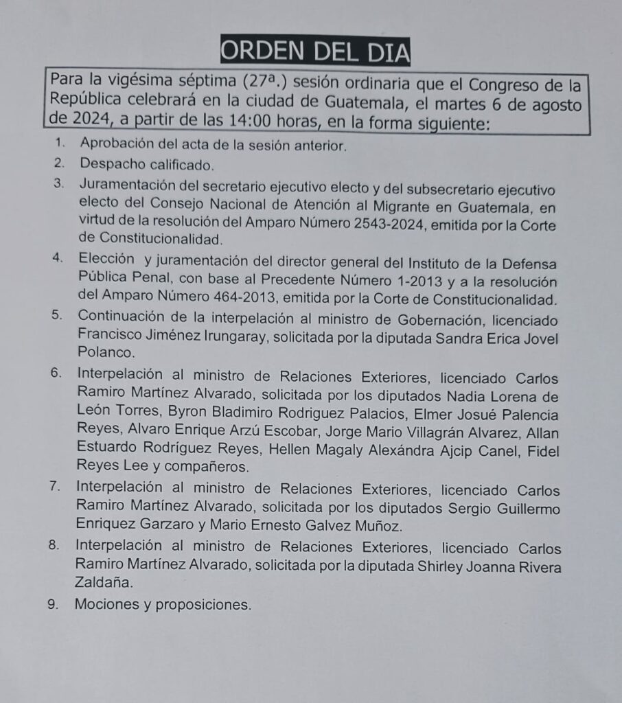 En la reunión, los líderes de bancada aprobaron en 17 minutos una agenda de nueve puntos que incluye juramentaciones e interpelaciones. Entre los temas a tratar, se encuentran la juramentación del secretario y subsecretario ejecutivo electo del Consejo Nacional de Atención al Migrante de Guatemala (Conamigua) y la elección del nuevo director del Instituto de la Defensa Pública Penal (IDPP), seleccionado de una terna propuesta por una comisión de postulación.
