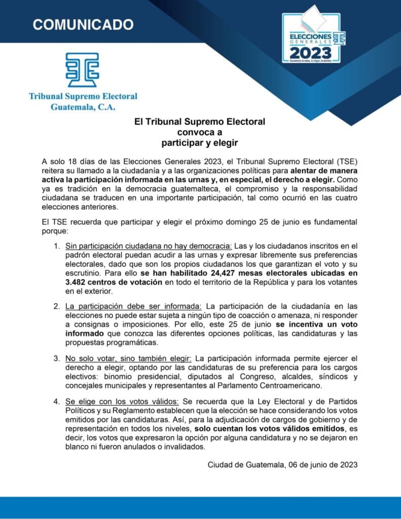 Por medio de un comunicado de prensa autoridades del Tribunal Supremo Electoral, TSE, hicieron un llamado a la ciudadanía y a las organizaciones políticas a promover la participación de los guatemaltecos de manera activa e informada a realiza su sufragio el próximo 25 de julio y ejercer su derecho a elegir.