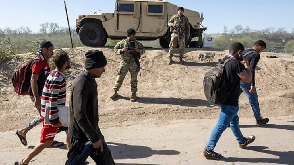 Inmigrantes de Venezuela pasan junto a soldados de la Guardia Nacional de Texas después de cruzar el Río Grande hacia los Estados Unidos el 8 de enero de 2024 en Eagle Pass, Texas.