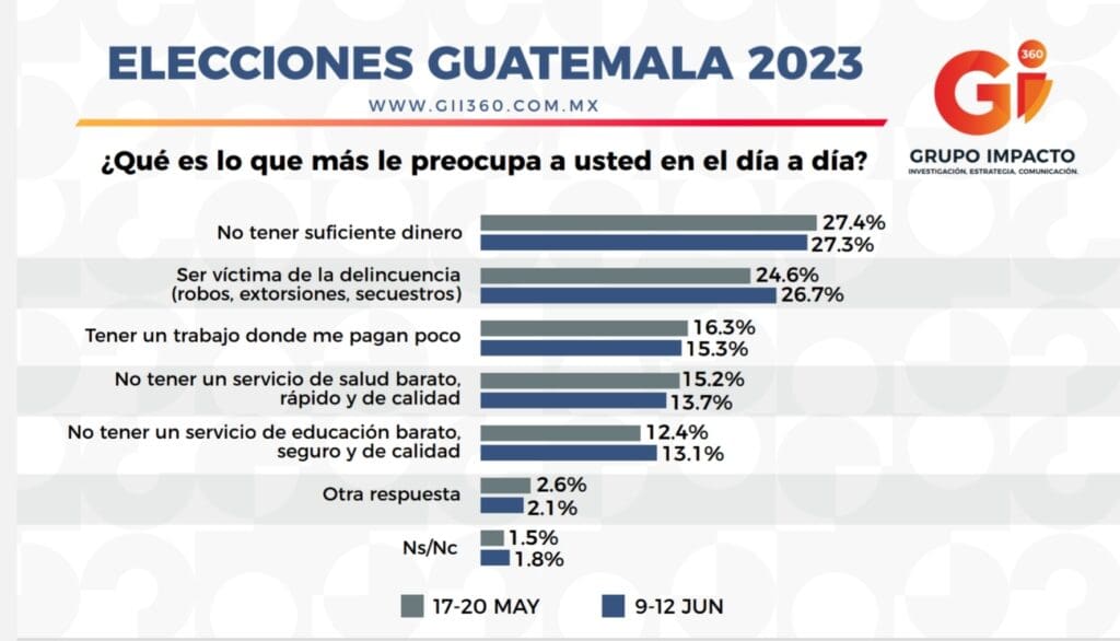 La falta de dinero, carecer de seguridad, una mala atención de salud y poca educación son los principales problemas que atañen a los guatemaltecos, comentó Aura Laura Arroyo, de Grupo Impacto Gii360.