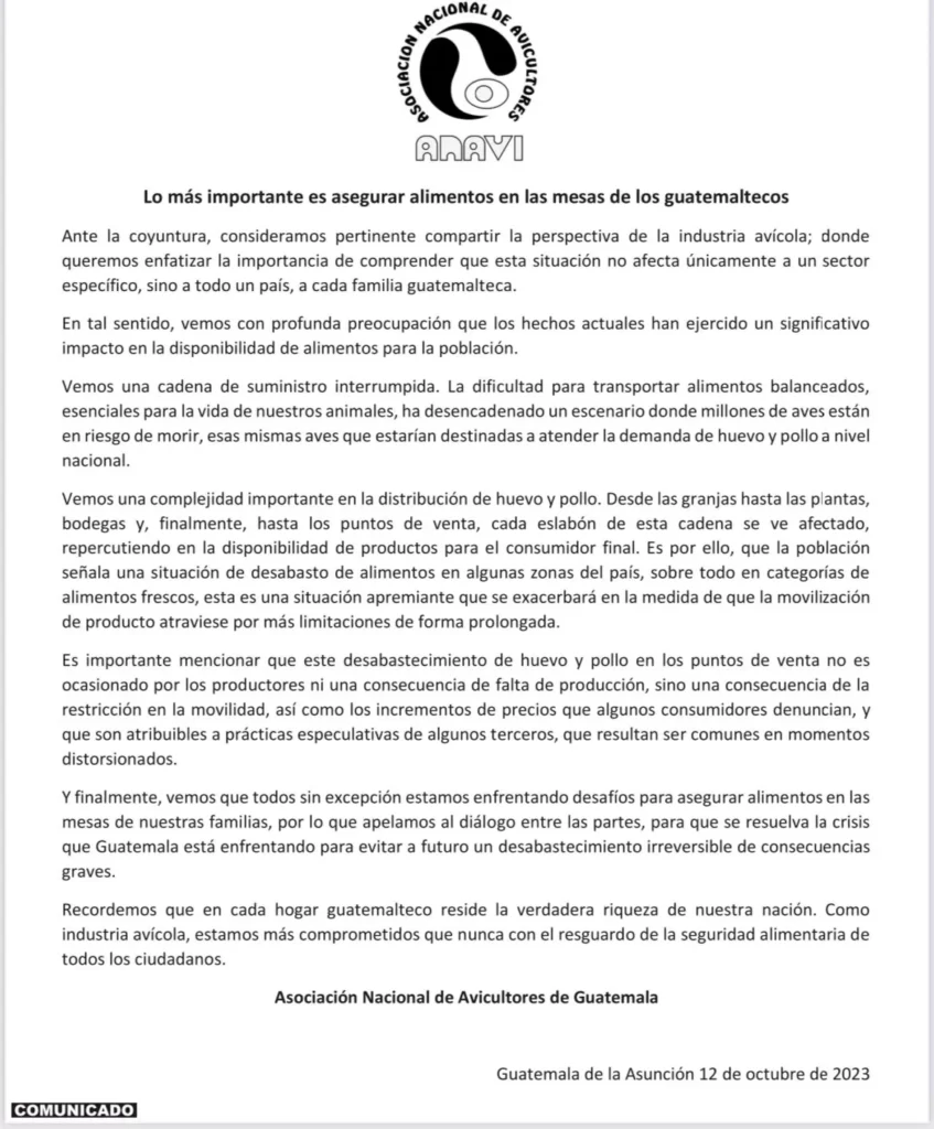 Anavi destacó la importancia de garantizar la disponibilidad de alimentos en las mesas de los guatemaltecos como prioridad fundamental en este contexto de crisis. La asociación exhortó a las partes en conflicto a resolver la situación actual para evitar posibles consecuencias irreversibles, como un desabastecimiento grave.
