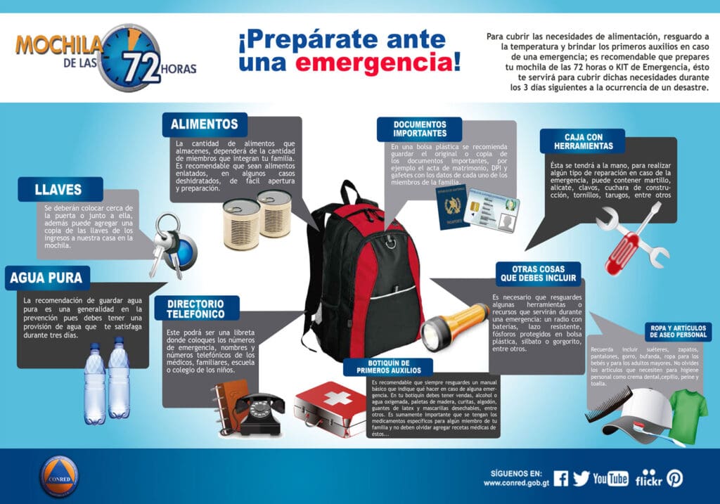 Autoridades de CONRED recomiendan tener a la mano los números de emergencia de su localidad y preparar la mochila de las 72 horas.