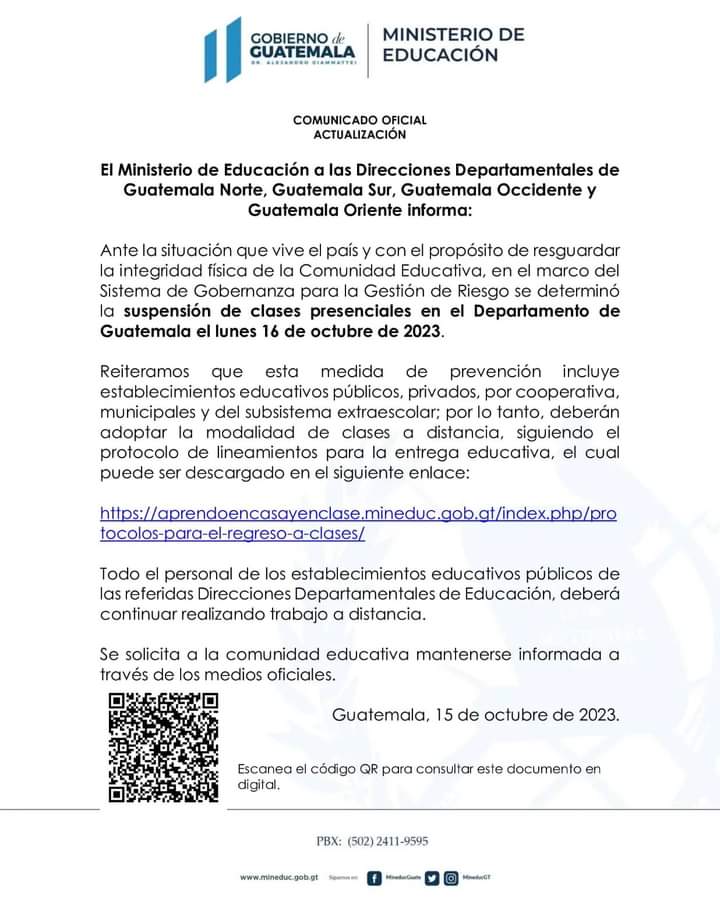 Por medio de un comunicado de prensa autoridades del Ministerio de Educación, Mineduc, informaron que: Ante la situación que vive el país y con el propósito de resguardar la integridad física de la Comunidad Educativa, en el marco del Sistema de Gobemanza para la Gestión de Riesgo se determinó la suspensión de clases presenciales en el Departamento de Guatemala el lunes 16 de octubre de 2023.