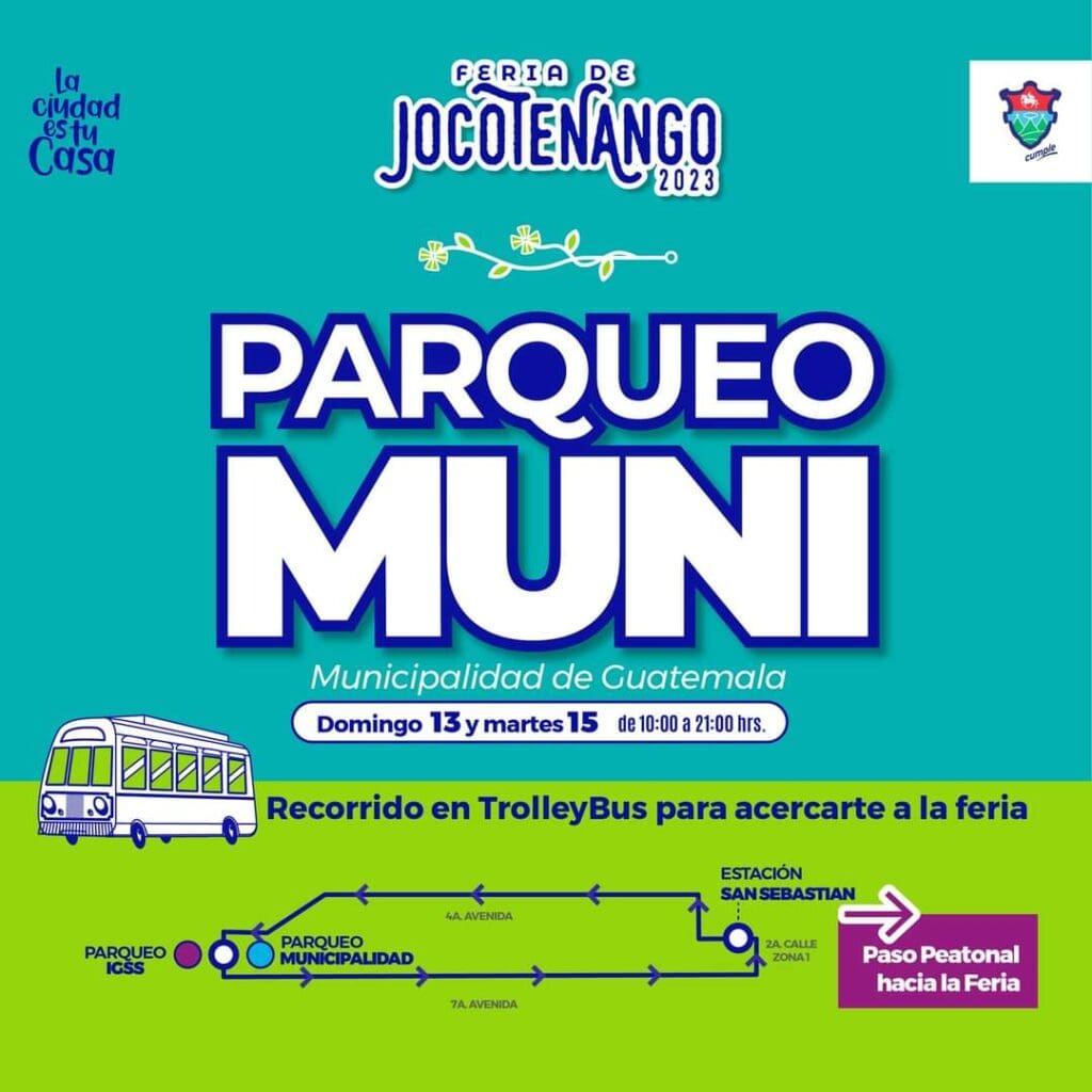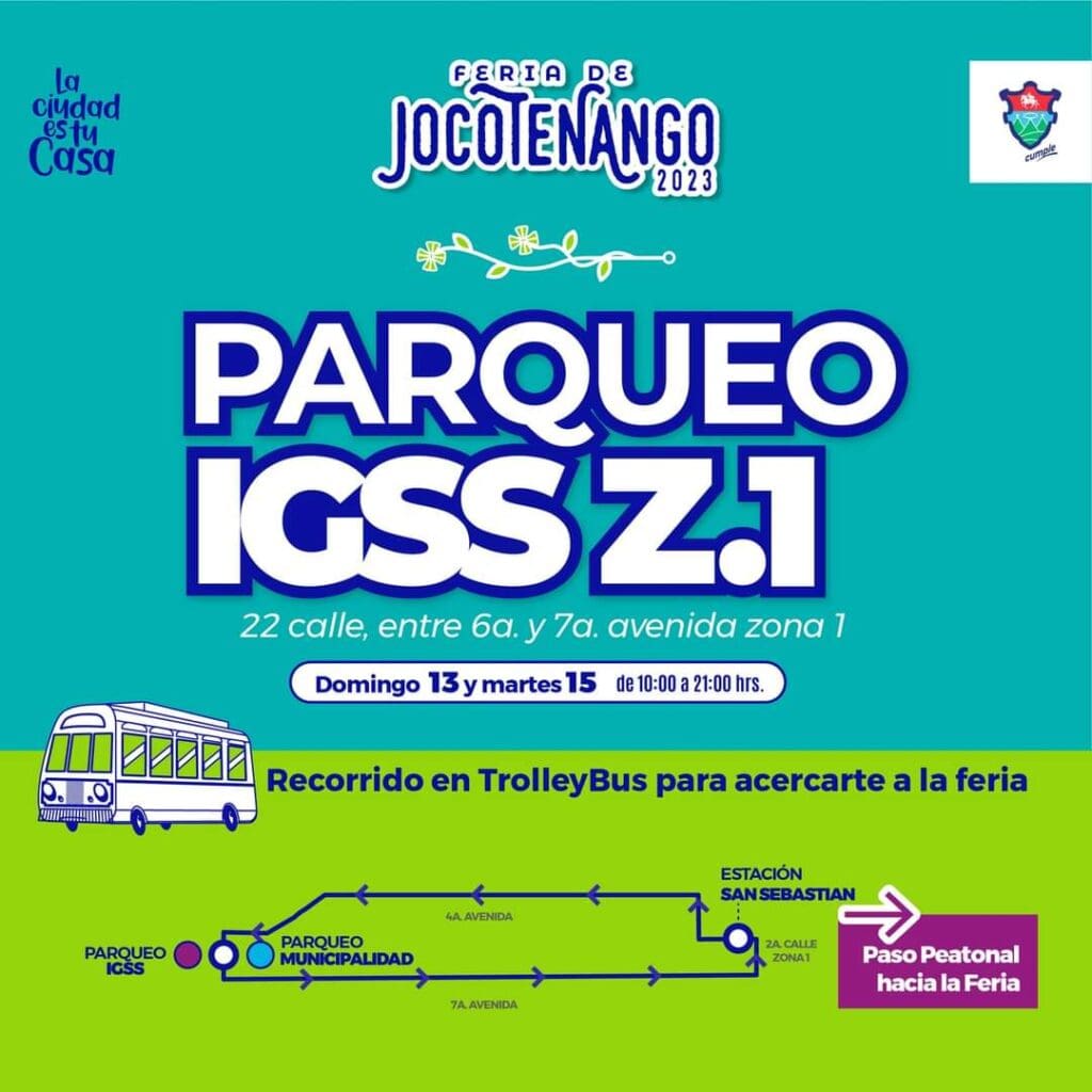 El Parqueo de la Municipalidad de Guatemala o Palacio de la Loba y el Parqueo del IGSS, estarán disponibles para quienes asistan a la Feria de Jocotenango el domingo 13 y el martes 15 de agosto, el TrolleyBus estará brindando servicio desde el Palacio de la Loba y el IGSS de la zona 1, los usuarios descenderán en la parada de San Sebastián para dirigirse por el paseo peatonal a la Feria de Jocotenango.