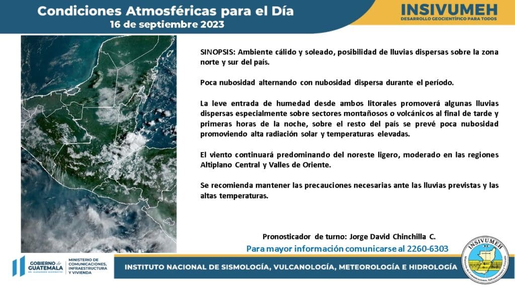 El pronóstico del tiempo para esté sábado 16 de septiembre por parte de las autoridades del Instituto Nacional de Sismología, Vulcanología, Meteorología e Hidrología, INSIVUMEH, señala que la entrada de humedad puede provocar algunas lluvias dispersas en sectores montañosos o volcánicos al final de tarde y primeras horas de la noche, sobre el resto del pais se prevé poca nubosidad