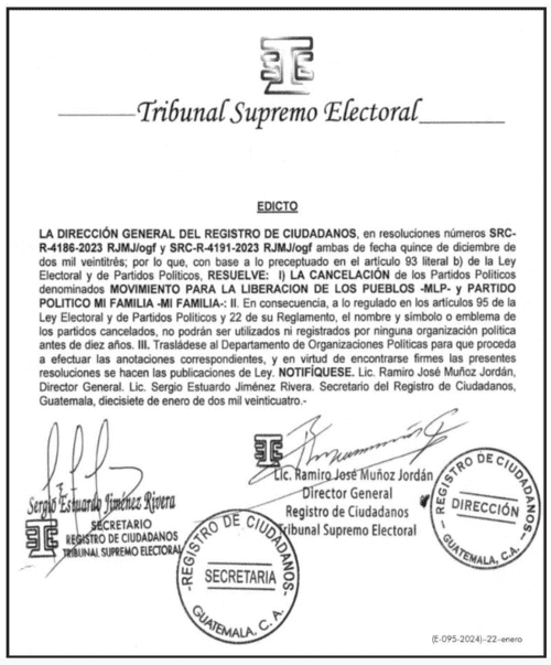 Entre los partidos afectados se encuentra el Movimiento para la Liberación de los Pueblos (MLP), que presentó sin éxito la candidatura de Thelma Cabrera a la presidencia y de Jordán Rodas a la vicepresidencia. La Dirección General del Registro de Ciudadanos del TSE confirmó la cancelación de esta agrupación mediante una publicación en el diario oficial.