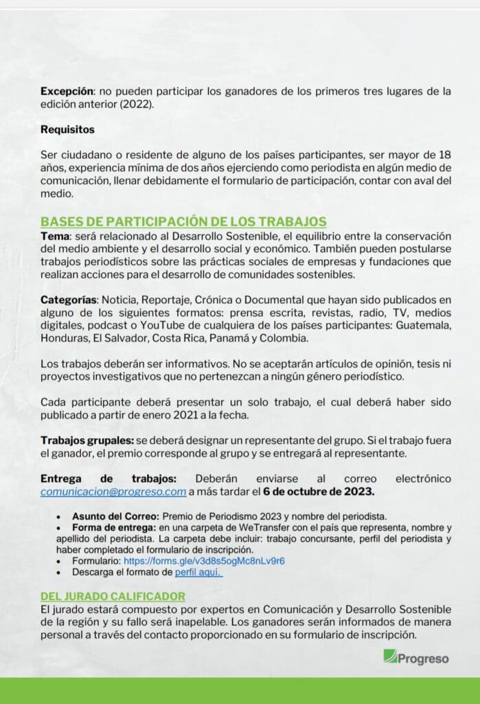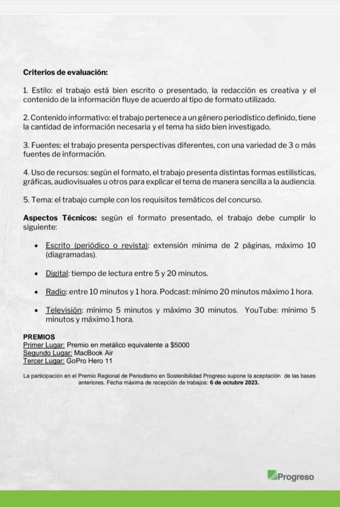 Progreso incentiva una vez más al gremio periodístico a participar de esta iniciativa y dar a conocer sus trabajos alrededor de esta temática, compartiendo historias inspiradoras que marquen la diferencia en la construcción de un mundo más sostenible. Para información detallada de las bases del concurso haz clic sobre la imagen que se te presenta a continuación: