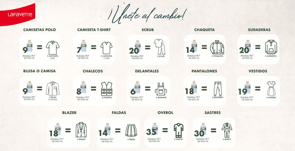 Cada prenda es confeccionada con el equivalente a un número de botellas PET. Para elaborar una camisa polo se utilizan alrededor de 9 botellas de 600 ml y hasta 30 botellas para un traje sastre.